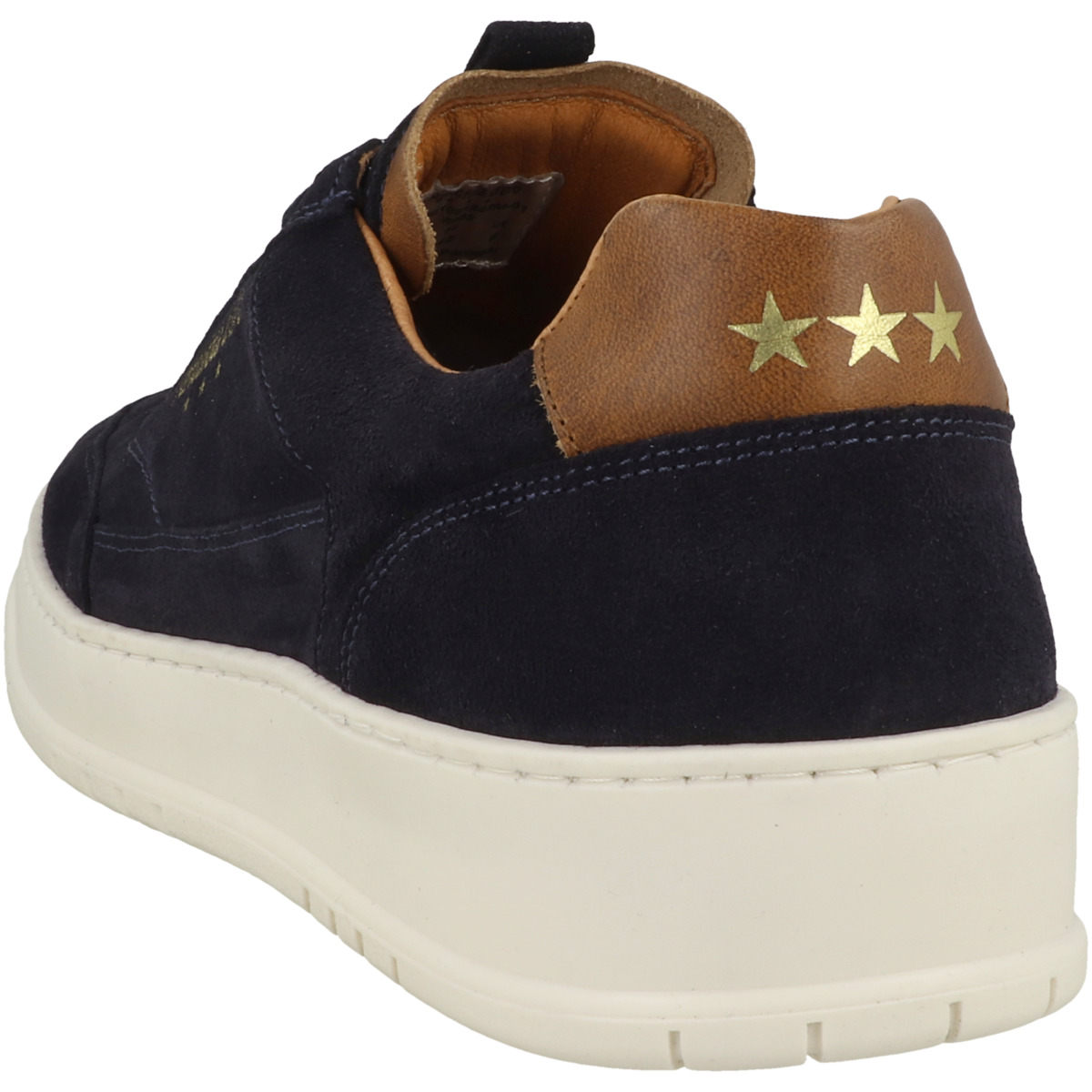 Der Schaft ist zusätzlich gepolstert, was für eine angenehme Passform sorgt. Ein Schriftzug an der Seite sowie die Zuglasche an der Zunge setzen dezente Akzente, während die drei Sterne auf der Ferse als Markenzeichen des Schuhs hervorstechen. Der Verschluss erfolgt klassisch durch Schnürung, die flache Sohle aus Synthetik mit Profil sorgt für einen sicheren Halt auf verschiedenen Untergründen.